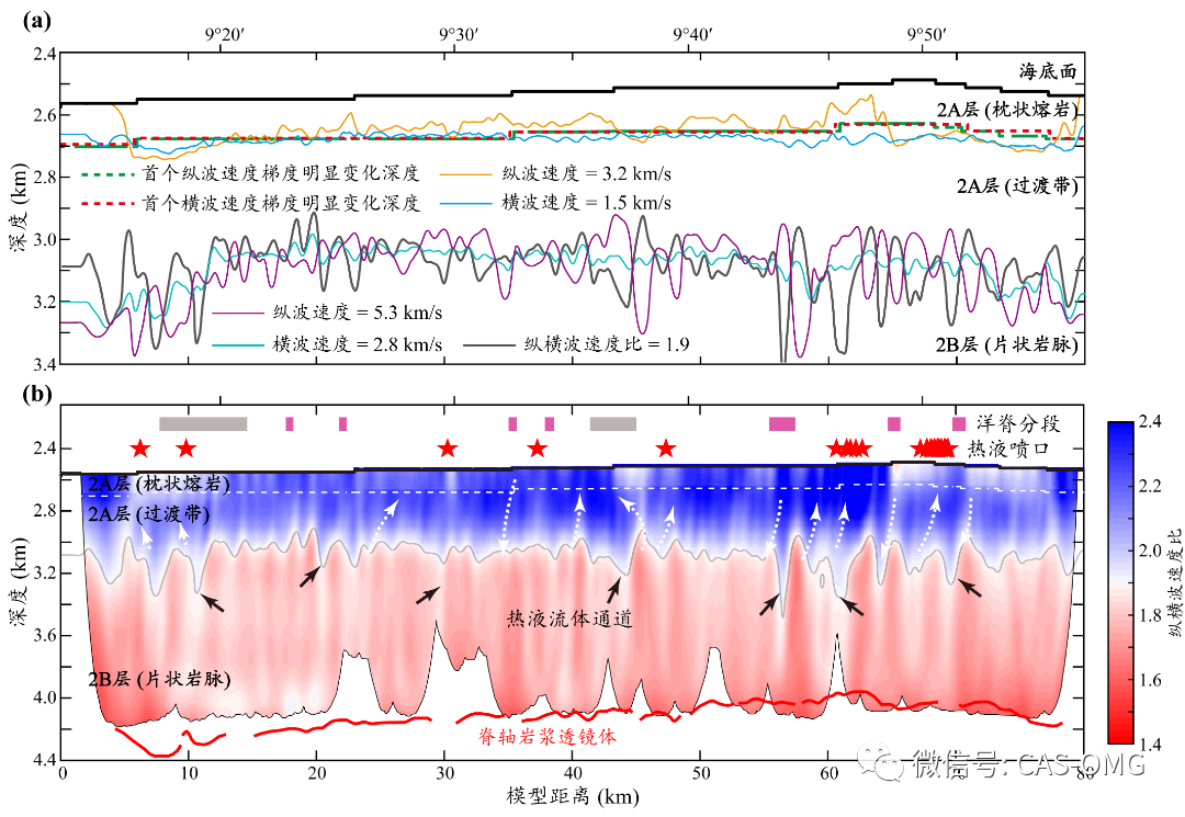 8 @# ?3 L2 a1 |) Q8 { 近日,中国科学院边缘海与大洋地质重点实验室(OMG)徐敏研究员团队在洋中脊精细地震成像方面取得重要研究进展,研究表明基于海洋多道反射地震数据可以直接反演洋壳结构的纵横波速比,从而更好的揭示洋壳流体活动。相关研究成果发表在国际地学期刊Geophysical Journal International(《国际地球物理杂志》)上。