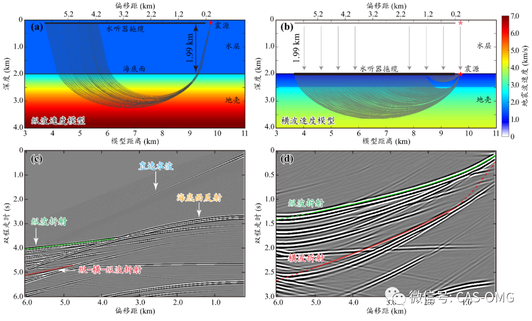图1 合成海洋多道反射地震数据测试结果。(a)向下延拓前的射线路径;(b)向下延拓后的射线路径;(c)原始的合成地震数据;(d)向下延拓后的合成地震数据。