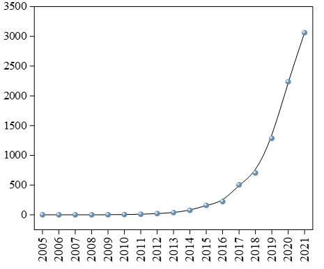 自从上个世纪中叶塑料被发明以来,由于许多优良的性能,它逐渐取代了许多传统材料。仅2017年,世界就生产了约3.35亿吨塑料。但由于塑料制品废弃后处置不当,塑料废弃物已经充斥了地球几乎所有角落,日益严重的白色污染也引起了人类的广泛关注。海洋是水文视域下集水区塑料污染的终点,据估计每年超过960万吨的人工聚合物最终将进入海洋。此外,海洋船舶航行、渔业捕捞、海洋养殖等行业也是海洋塑料的重要来源。有研究者分析称,2025年海洋中塑料废物重量将超过海洋鱼类。海洋环境中的塑料污染一直受到广泛关注,其中,人造聚合物粒径小于5 mm的微塑料的污染也越来越受到人们的关注。近年来,随着公众环保意识逐渐提高,微塑料污染研究数量呈指数上升。 $ r. p u/ u% X