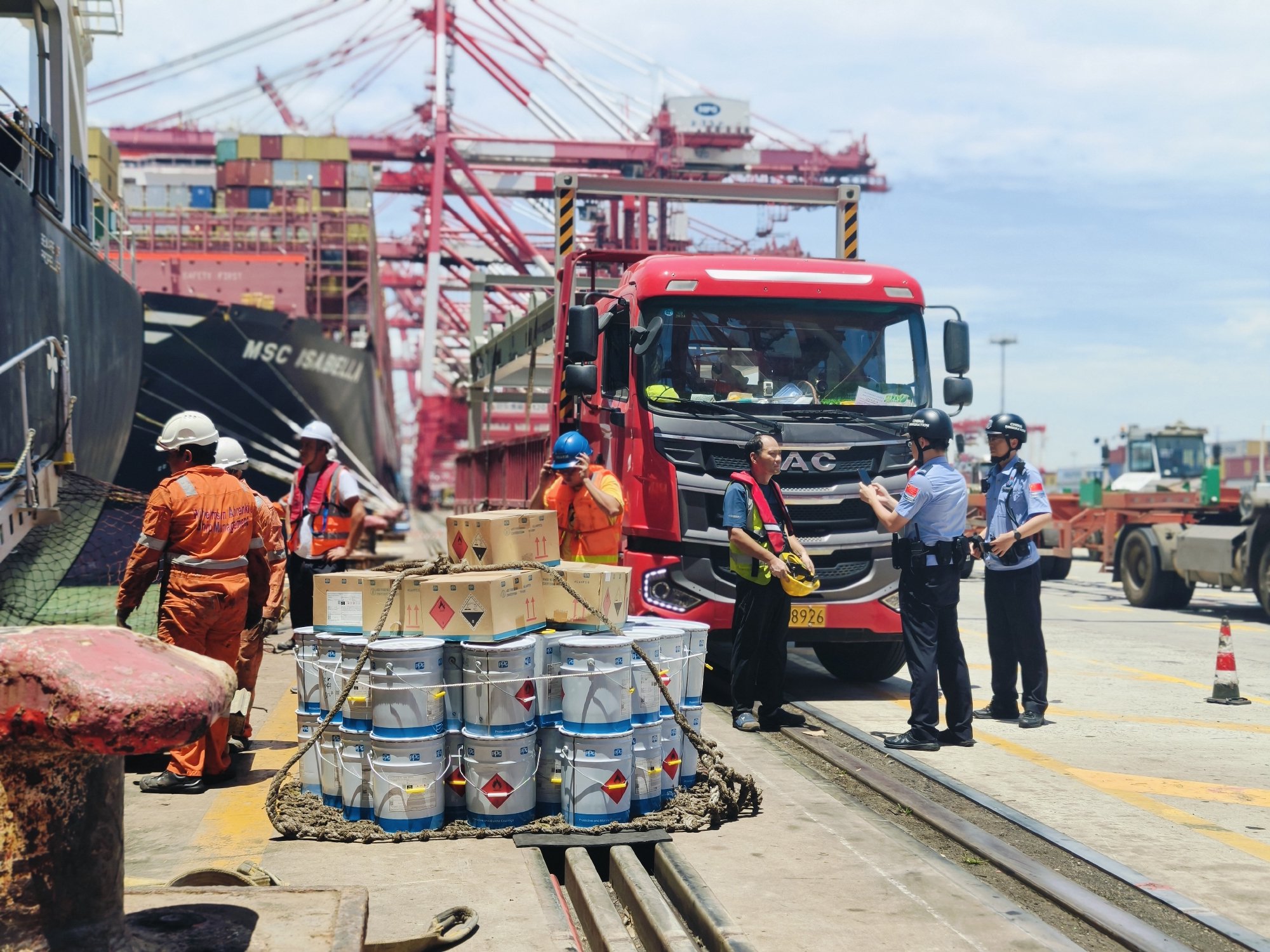 ) C; e; N+ n' f 洋山边检民警核查进出港区人员证件。 蒲莹 摄 ; g) v1 h/ x+ Q' t9 J) p# B, w
