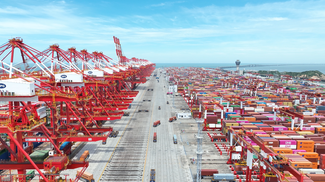 船多、车多、人多,今年以来洋山港呈现了不同以往的繁忙。受红海危机影响,部分欧洲航线、美东航线船舶绕行好望角,航程变长,航运企业增加了船舶投入数量。同时,部分单船载箱量超2万标箱级别的大运力船舶进入集中维保期,需要更多小运力的船舶承接,客观上促进了船舶数量的增长。 . w* R' X( O T& K