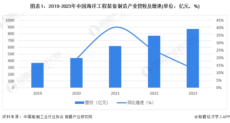 当前我国海洋工程装备制造业发展态势良好,有力支撑了海洋产业发展和海洋强国建设。2019-2023年,我国海洋工程装备制造产业营收呈现逐步上升趋势,增速自2021年以来有所下滑。根据数据显示,2023年,我国海洋工程装备制造产业营收约872亿元,同比增长12.81%,2019至2023年CAGR为23.99%。 5 c1 E6 I. i y" V