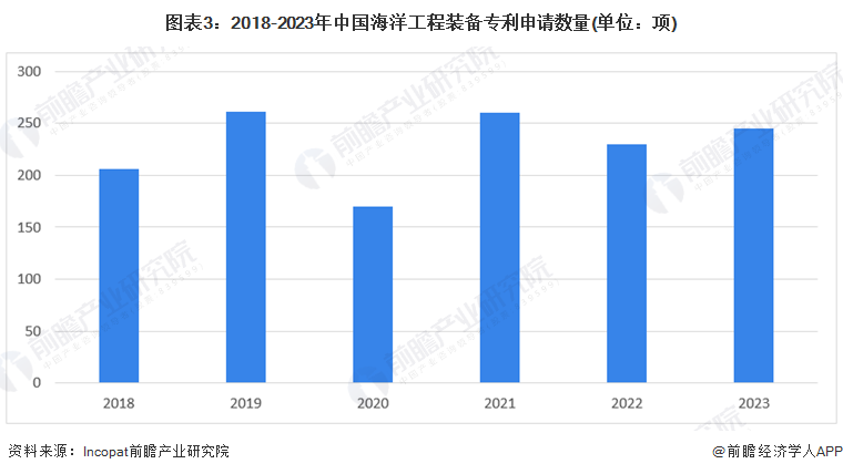 9 P2 p7 S" Y2 g! T9 K4 O: R 我国海洋工程装备专利申请数量呈现波动增长趋势。根据数据显示,2023年我国海洋工程装备专利申请数量达245项,同比增长6.52%,2018年至2023年CAGR为3.53%。
