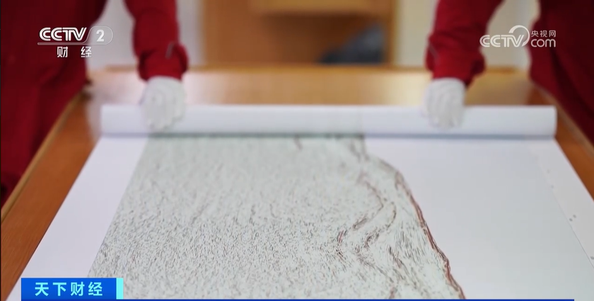 ) b2 v) O& E" `1 O5 S! F 总台央视记者 王世玉:在首张海底3000米地质勘探图的绘制现场,打印出来的首张海底图,第一次呈现海底3000米的样子。这张图全长6米,从浅到深。