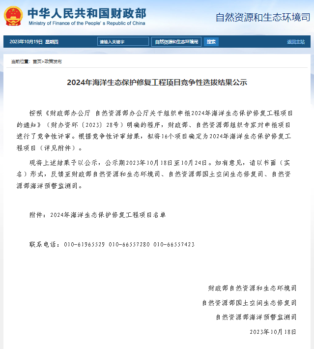 4 N% f$ [% C5 n7 F% m5 ^' `/ Q; y 2023年10月18日,财政部公示2024年全国海洋生态保护修复工程项目竞争性评审结果,我省湛江、深圳、茂名3个项目突围而出,其中湛江、茂名分别获得中央资金支持3亿元,深圳获得中央资金支持4亿元,是广东首次实现单年度三个项目通过中央竞争性评审。 " j2 V' n( R1 n3 P/ ^& U7 w9 u