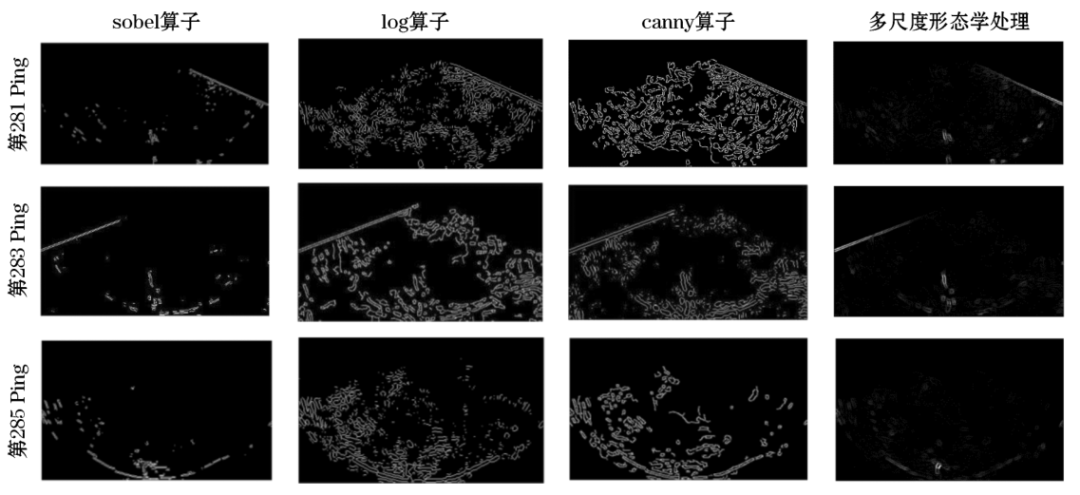 9 V( _, _3 G2 P* @' m# \ 对平滑得到的高信噪比图像进行边缘检测后,目标的边缘信息和纹理信息能得到完整的复现。如图8所示,分别用一阶sobel算子、canny算子和二阶Log算子进行边缘检测的对比:sobel算子边缘检测的连续性略差,导致部分信息有漏检的现象;canny算子产生的边缘较细,没有体现出噪声和目标物体的强弱差别,影响判读;Log算子对噪声敏感,边缘连续性也较好,但和canny算子一样都出现了过检现象,噪声边缘也被提取出来。多尺度形态学边缘检测相比于这些算子边缘检测算法,能消除孤立噪点,提高任意两点间的边缘点占比,边界信息的连续性更好。多尺度形态学边缘检测无明显噪声点且目标保留完整,噪声点边缘与目标物边缘区分度较高,可以快速准确识别目标物体。