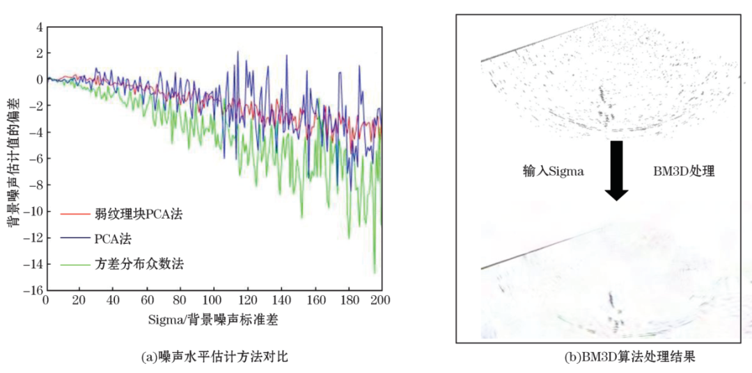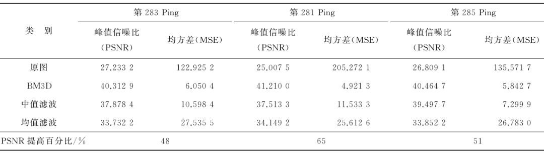 + _ k3 }. p' E: {% |/ r 根据图7a的统计结果分析得出结论:基于弱纹理的PCA方法随着背景噪声标准差的增大,估计值与真值的误差变化相对更稳定,对水体影像的噪声估计效果明显最好。PCA法和样本方差众数估计法计算的偏差在标准差超过80后,振动幅度急剧增加,鲁棒性较差。将参数输入作为Sigma值,对噪声图像进行平滑操作(图7b),该算法实现了水体影像的高度稀疏化,MSR内的“斑点噪声”基本被滤除,图像中的目标物细节特性保留得较为完整,且具有更高的运行效率。选取3Ping水体影像数据使用本文方法处理,计算峰值信噪比(PSNR)比较图像质量,再选取传统的中值和均值滤波器处理图像与(BM3D)方法进行对比。从表2可以看出,虽然3种方法处理后图像质量均得到优化,但BM3D算法处理后的图像PSNR指标获得了显著提高,提高百分比最高达到65%,优于其他2种方法。 & \' J& |1 I+ T4 T+ {/ Q6 Y