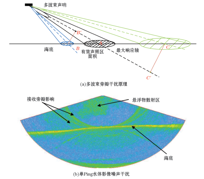 : x- {* ?$ p' W g+ T0 r8 ~ MSR范围之内的探测虽受到发射旁瓣的干扰,但该范围海水回波强度稳定,MSR之外的范围则受到接收旁瓣的干扰,影响尤为显著,噪声掩盖了部分真实信号。如图2a所示,接收主瓣接收的回波采样点记录为A点,内外侧接收旁瓣则,分别记录了B点和C点的反向散射强度,记录水体数据时将B点和C点归算到主波束的最大响应轴上即为B点和C点,随之就会产生反向散射强度的异常增强。所以在多波束的一Ping水体数据中随着波束角变大,这种线性干扰就会更强。外侧的干扰在单Ping水体影像中体现为海底下方的干扰,不影响影像的判读。 ! F6 q' R& S3 }8 M& |