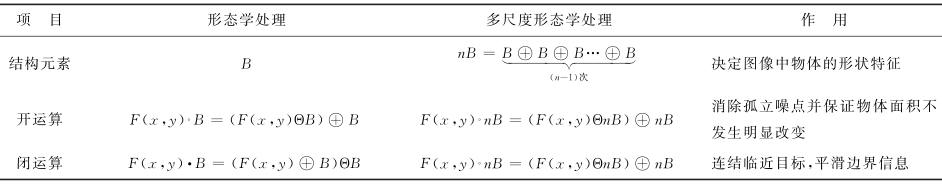 ], p8 c0 h4 |6 s 数学形态学应用于图像处理中,形态学算子能表达物体形状的集合与结构元素间的相互作用。形态学图像处理是在图像中移动一个结构元素,然后将结构元素与下面的图像进行交、并集运算。结构元素的形状和尺寸会影响图像边缘检测的效果:小尺寸的结构元素去噪声能力弱,但能检测到边缘细节;大尺寸的结构元素去噪声能力强,但检测的边缘较粗。多尺度形态处理方法及作用与传统方法比较见表1。