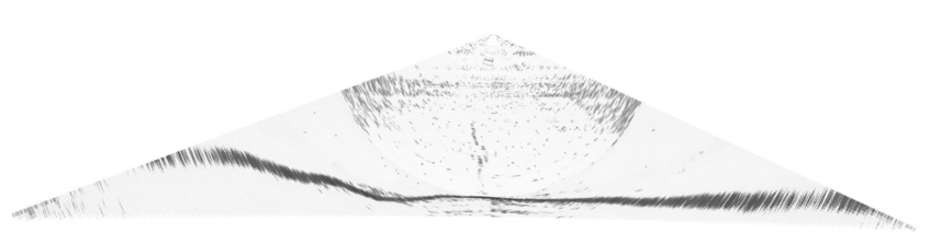 ; F6 y1 ?9 d: J8 C3 o 为验证本文的目标识别方法,利用EM系列多波束声呐系统采集的实测数据开展试验。解析原始水体数据,将一整Ping内所有水体数据采样点的反向散射强度转化为相应的灰度值,形成扇形垂向影像图(图4)。由于边缘波束的波束角变大,旁瓣效应增强,两侧的发射旁瓣效应噪声强度较高,解得的实际水体影像数据MSR外接收旁瓣噪声影响显著,MSR内发射旁瓣噪声与海洋环境和系统噪声干扰混合,多种噪声驳 ' R# L3 _1 U# {5 q7 i: [