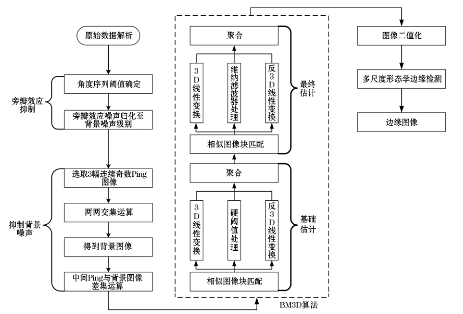 7 Q, s0 M9 v7 P4 B( U 本文提出一种阈值降噪和形态学检测相结合的目标提取方法。首先针对旁瓣噪声强度分布特点的阈值方法削弱干扰;其次通过图像的交、差集运算消除背景和系统噪声;然后利用BM3D算法平滑图像得到高信噪比图像,剔除背景消噪遗留的“斑点噪声”;最后利用多尺度形态学处理获取边缘图像,这种综合性的目标提取方法能大幅削弱孤立噪点的影响,有效提取边缘完整连续的水体目标,处理后的EM系列多波束数据证明了该方法的优点和普适性。