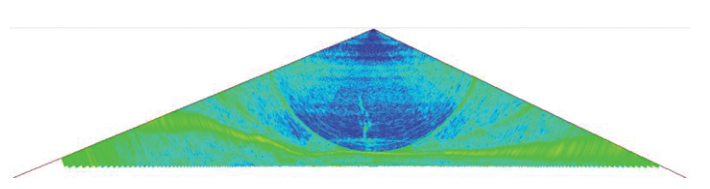 4 d3 w# m3 B& Q( D+ t: N 使用局部标准差阈值算法(式1),针对每个角度序列计算均值和标准差,当标准差参数α=1.3时,处理后的水体影像数据如图5。MSR外接收旁瓣干扰得到很好的抑制,去噪效果明显,MSR内的噪声大部分归化为背景噪声级别,目标物体的信息保留得也较为完整。