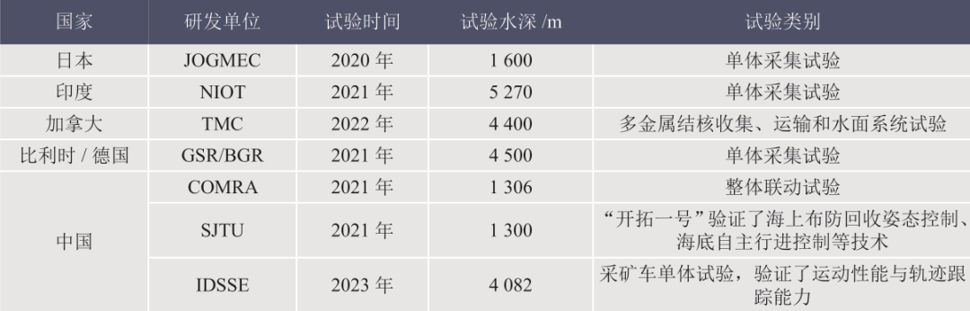 海底采矿车实质是一种海底行走车,与水中科考机器人相比,在海底行走的方式增强了运行稳定性,依靠编码器即可进行较准确的定位,也不需要考虑精准的配重问题、六自由度控制问题及海流干扰等难题,大大降低了设计难度。能在海底松软底床上行走的方式有多种,早期的采矿车有拖曳式和阿基米德式底盘,但因为适应性不强而被逐步放弃。现在的采矿车均采用履带式底盘。履带式行走车搭载相应的采样探测装置即可完成对海底的长时间全方位探索,脱离海底采矿系统,形成单独的海底自主行走车研究体系也是水下科考作业装备的发展趋势,中国科学院深海科学与工程研究所郭威团队研制的海底自主式行走车,于2023年9月在南海完成了4082m的水下行走试验,验证了运动控制与行走精度,仅依靠轮组上的编码器即获得了高精度的定位结果。表1为2020—2023年国际上进行的深海采矿车试验。 Y, x' T, C2 p: m