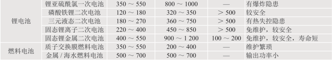 + G$ z5 \0 {; E 为支撑水下载体的长时间大功率工作,需要高能量、高功率密度动力技术。对于体积较大的深海空间站,可采用核动力、柴油机无空气推进(AIP)等系统。对于小型潜器,多采用电池,电池形式多样,性能差异较大,但当前锂电池技术发展较快,在潜水器中占有的比例越来越大。主要电池的分类汇总见表2。