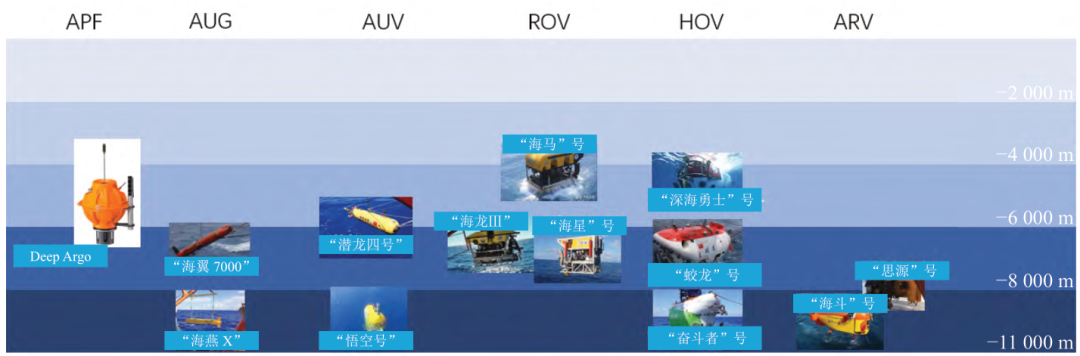 图1 我国主要深海机器人 , l! V9 Y j% ^9 T& P' L8 i* o" i