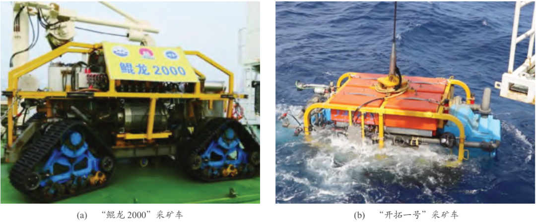 % ^5 _9 G, `4 }5 t \: ]6 R 海底采矿车是一种重要的水下作业装备,是水下采矿系统的重要组成,可携带大功率的吸取传送装置采集海底矿物。美国、加拿大、德国和日本等国是较早开启水下采矿系统研究的国家。我国自20世纪90年代以来大力开展深海采矿技术研究,已经取得了丰富的成果。在采矿车方面,长沙矿山研究院有限责任公司积累了丰富的研究成果,牵头研制的“鲲龙”号具有代表意义,2019年,在2900m的水下,成功采集了150kg的富钴结壳。2021年,上海交通大学牵头研制的重载作业采矿车“开拓一号”成功进行1300m深海试验,验证了海底的基本运动控制功能。图2为我国研制的深海采矿车。 / Z V9 d4 ]. V% }