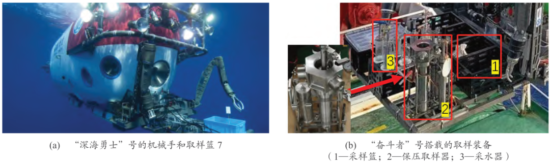 深海海底高压、无光和低温的环境造就了独特的深海底物特征,为了较好地保持样品原位特征,发展出了能保压的原位取样器。此类采样器主要有保压和密封功能,并且通常设置压力补偿器补偿环境压力的变化。我国HOV搭载的取样器如图5所示。