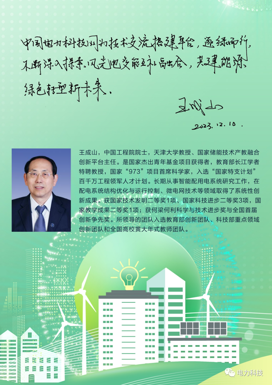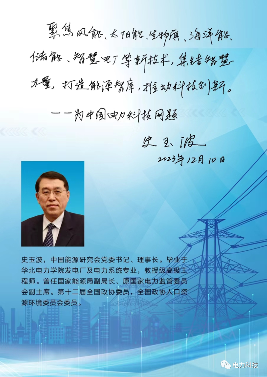 6 c% ~/ _7 w1 H/ ] B9 s4 r$ k 魏毓璞主任与中国能源研究会理事长史玉波、副理事长孙正运,天津大学教授/中国工程院院士王成山进行交流,他们对中国电力科技网在可再生能源和新型电力系统领域的出色工作表示认可、支持,史玉波理事长、王成山院士亲笔题词。 * E( a# }# R1 a j. P& Y/ ]
