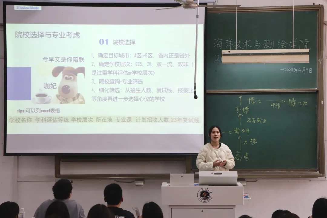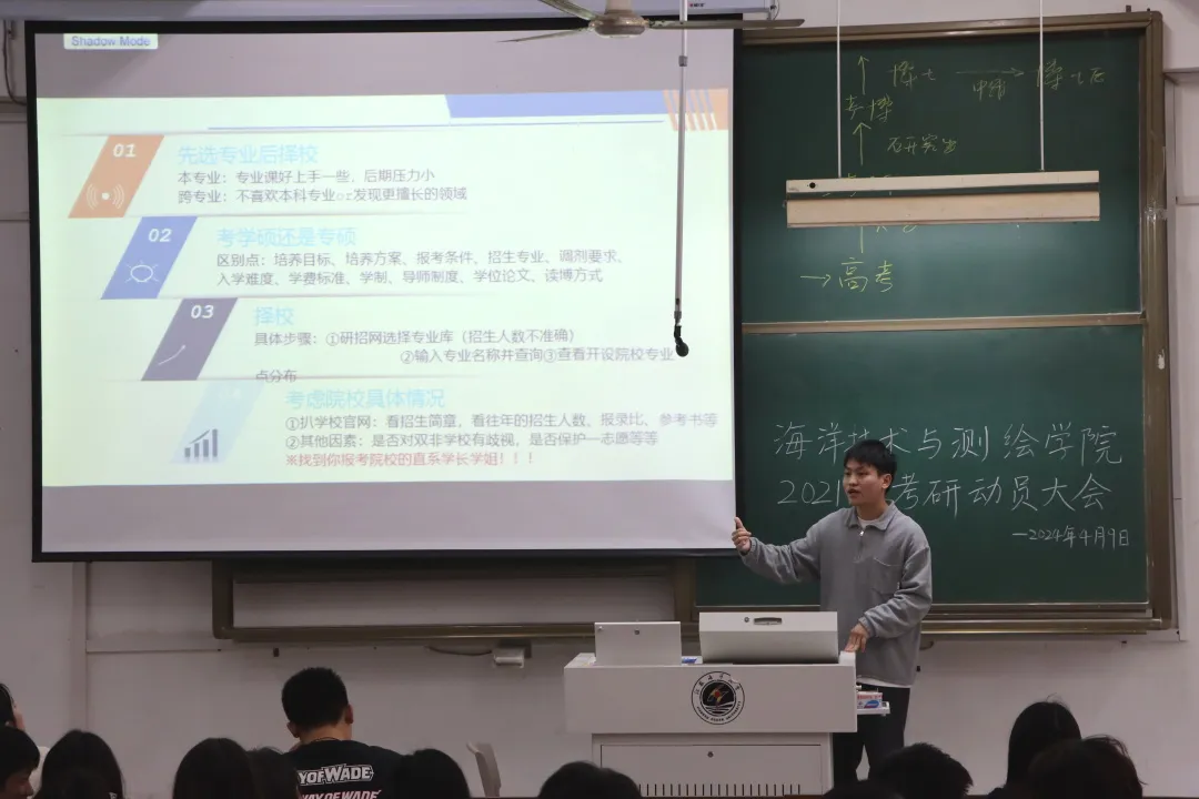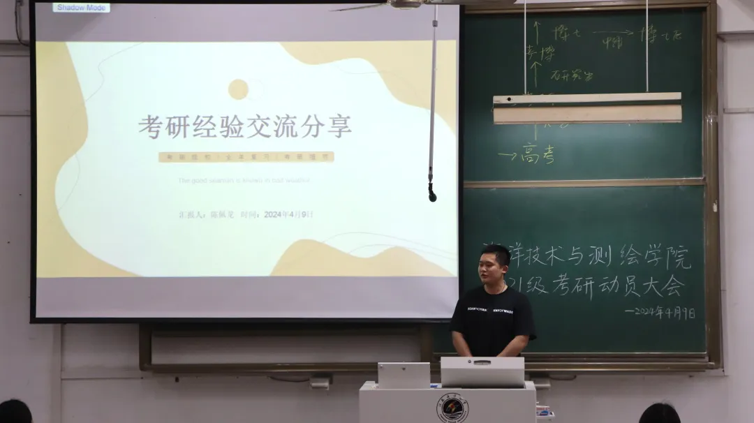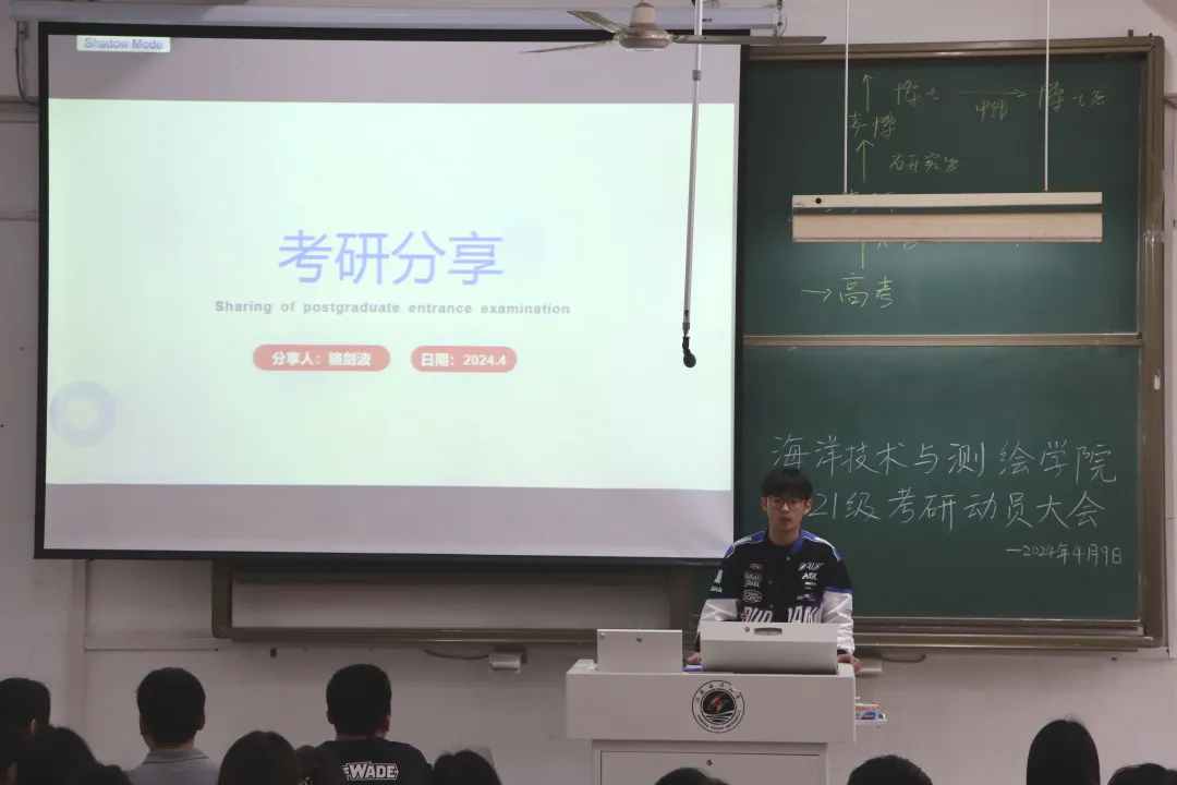 为帮助大三学生了解考研形势,明确考研目标,增强考研信心。4月9日下午,海洋技术与测绘学院举办2021级考研动员暨经验交流大会。学院党委副书记田扬启、青年博士教师田祥雨、20级考研上岸的王秋雅、骆剑波、沈昊、陈佩龙出席动员并分享经验,全体2021级同学参加动员会。动员会由学工办主任周琦主持。