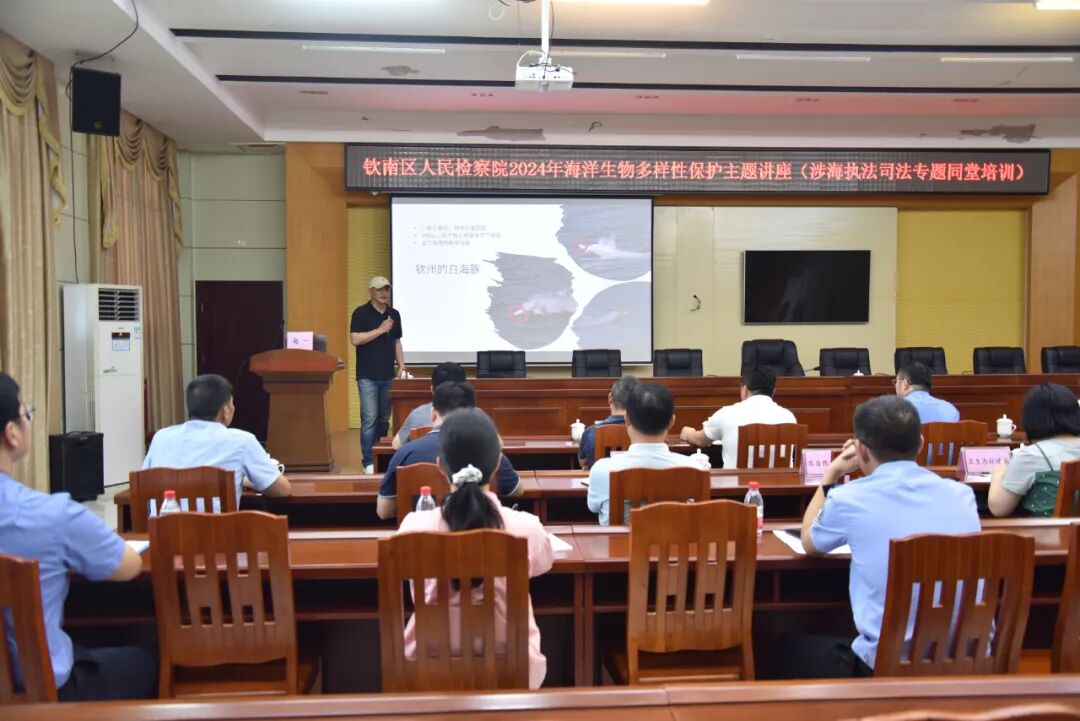 为进一步凝聚海洋公益保护合力,提升海洋检察公益诉讼办案质效,5月10日,钦南区人民检察院组织开展海洋生物多样性保护主题讲座,特邀钦州市北部湾中华白海豚保护与生命教育中心监事会主席赵一、副理事长潘岳进行授课,同时邀请钦州市三娘湾旅游管委会、钦州海警局、钦州市公安局钦南分局和港区分局,钦南区法院、农业农村局、生态环境局、自然资源局及沿海乡镇政府等15家单位代表同堂培训。