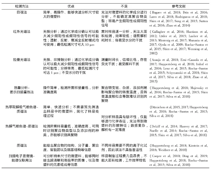 ; S% p5 _1 ?) c9 T% v' f7 M  图1 微塑料检测技术示意图一微塑料样本取样及样品处理目前,海洋中微塑料的研究对象主要是海水水体、沉积物及海洋生物体,针对这三类样品微塑料样品的取样及样品处理步骤主要分为三步,包括取样、分离以及消解。1.取样微塑料在海水中的分布由多种条件决定,如密度、形状、尺寸、吸附的化学与生物物质以及风、浪的作用等。海水表面微塑料的丰度要比水深1~2 m时要高,取样时需考虑深度的影响。取水样可使用拖网、筛和泵等多种工具,就目前研究来看,多数使用拖网。拖网的优点在于能够收集大量体积的水,并将微塑料集中在一起。微塑料在沉积物中分布不均匀,易受环境因素的影响,在取样时应保证随机性,从而使得取样具有代表性。沉积物取样一般是在潮间带及潮下带,使用不锈钢匙或铲、岩芯取样器以及抓斗式采泥器。取样量一般在0.5 kg以上,有的研究取样也可达10 kg,取样深度一般是表面至5 cm深处。2.分离将微塑料从样品中分离出来一般采用过滤、筛分及密度分离法。过滤或筛分是从水样中分离微塑料最常用的方法,过滤器的孔径与筛子的目数决定了检测微塑料的最低粒径。但如果孔径与目数过小,会使得有机物等杂质堵塞装置。大多数研究使用的孔径与目数均不相同,尺寸变化范围较大,尚未有统一的标准方案。从沉积物样品中分离微塑料时,可先将沉积物样品进行筛分预处理,然后进行密度分离法操作。3.消解水样和沉积物样品中通常含有机物和生物物质,影响分析结果,须设法将其去除。常用方法有酸消解、碱消解以及氧化还原消解等。目前对于生物体中微塑料的研究主要集中在动物的消化道。常取样的动物有鱼、海龟及海鸟。二目测分析法现阶段,研究人员大多采用目视分析法对样品中微塑料进行计数。使用该法量化微塑料时,首先将海水或沉积物通过滤膜过滤分离微塑料,将过滤后滤膜采用裸眼或显微镜观察,根据滤膜上微塑料的形状、尺寸和颜色对其进行分类并计数,然后采用仪器分析方法(光谱分析、热分析、质谱分析等)对筛选出的微塑料进行进一步确认,以最终确定初始样品中微塑料数量。裸眼可以根据颜色、形状对尺寸较大的样品进行分类,但难以分析微米级的样品。光学显微镜除了能够得到样品的颜色和形状外还能够得到其表面纹理或结构信息,而且也能够分析微米级的样品。虽然裸眼和显微镜能够简单直观地对样品进行分析,但是两者仅能通过外观形貌模糊地识别微塑料,无法得到样品的组成信息,这样难免会产生假阳性或假阴性信号,而且对于两种外观相似的微塑料也难以辨别其类型。目视分析法在尺寸和形貌表征方面有其独到的优点,但是无法准确地从样品中甄别出微塑料,目前显微鉴别类似微塑料样品的误判率通常超过20%,所以需要与其他分析技术(如光谱)联用才能事半功倍。三光谱分析法1.傅立叶变换红外光谱法傅立叶变换红外光谱(FT-IR)法具有不破坏样品、预处理简单等优点,被广泛用于微塑料的定性检测与成分分析,其优势是能够确定聚合物的类型。FT-IR法有反射和透射两种模式,两者均可用于微塑料的检测。透射模式能够提供高质量光谱,但需要红外滤光片,而反射模式可以快速分析一定厚度和不透明的样品,较适合检测环境样品中的微塑料,因此可以根据不同的需求灵活地选取操作模式对特定的样品进行分析。研究表明,微塑料在环境中的老化以及表面遭受污染会导致其难以被检测识别。此种情况下,如果对其进行处理再检测则耗时费力,极不方便,因此开发高效检测老化严重微塑料的方法至关重要。近年来,基于焦平面阵列(FPA)的FT-IR在微塑料检测领域越来越受到关注。相比FT-IR只能对微塑料碎片或颗粒逐一分析,FPA-FT-IR能够大面积的检测微塑料,效率极大提高。2.拉曼光谱法拉曼光谱(Raman)法是一种基于光的非弹性散射的振动光谱技术,由于在检测微塑料方面具有如无破坏性、低样品量测试、高通量筛选和环境友好性等显著优势,因此迅速受到研究者青睐。当激发光照射到样品上时,由于分子的振动而使激发光发生非弹性散射并产生拉曼位移,从而得到物质的特征拉曼光谱。激发波长越短,拉曼光谱的空间分辨率越高,所以在检测微塑料时激发光的波长选择紫外-可见波段可使分辨率提高到微米级别,但是这样会使荧光干扰加强,致使荧光信号峰与拉曼峰重叠。如果微塑料表面老化或者受到生物污损,拉曼测试时容易产生荧光干扰。此外,由于部分物质红外活性和拉曼活性互斥,即有红外活性则无拉曼活性,反之亦然,故红外光谱和拉曼光谱在检测微塑料时或许可以相互补充。与FT-IR法相比,Raman法显示出更好的空间分辨率(低至1μm,而FT-IR为10~20μm),K覿ppler等(2016)将FT-IR法与Raman法进行对比,发现Raman法在检测尺寸较小的微塑料方面更胜一筹,可以检测到5μm左右。虽然两者在检测20μm以上的微塑料时性能相近,但是FT-IR检测11~20μm范围内的微塑料时却有40%的误差,5~10μm范围内的微塑料几乎检测不到。而且,Raman法具有更宽的光谱覆盖范围,对非极性官能团具有更好的响应性,不受水分子的干扰以及具有更窄的光谱带。然而,Raman法测量技术也具有一定的不足,如测量时间相对较长、易产生荧光干扰以及信噪比低等,此外由于该方法使用激光作为光源会导致背景发射并伴随聚合物降解。需要指出