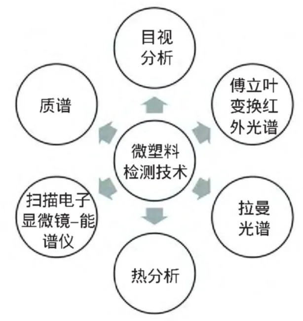 & T) G% _9 F+ f" U* p 作者:王俊豪,梁荣宁,秦伟 环境中微塑料的识别和检测方兴未艾,准确可靠、简便高效的分析方法对微塑料的检测至关重要。目前,微塑料检测通常包括尺寸形貌表征及化学元素组成的分析。1~5 mm范围内的微塑料可以通过裸眼进行筛选,尺寸为微米级的则需要借助显微镜进行观察。由于某些类似微塑料物体特征模糊,使得很难仅通过目视分析准确识别微塑料,因此需要借助其他手段,如光谱、质谱、热分析等方法进一步表征。尺寸、形状、颜色、聚合物类型等因素使得微塑料的准确识别阻力重重,难以得出一致通用的分析方法。为了向微塑料污染研究者提供更好的借鉴和参考,本文系统综述了目前应用较广泛的微塑料分析技术和手段,其中首先总结了微塑料样品采集及预处理方法,并进一步介绍了微塑料目前主流的检测技术,如直接目视分析法、光谱法(如傅立叶变换红外光谱法和拉曼光谱法)、热分析法以及其他分析方法(如质谱法以及扫描电子显微镜-能谱仪联用法)等(如图1所示),简要评价了目前这些检测方法的优点和局限性,以期为微塑料检测技术的发展做出一定的贡献。