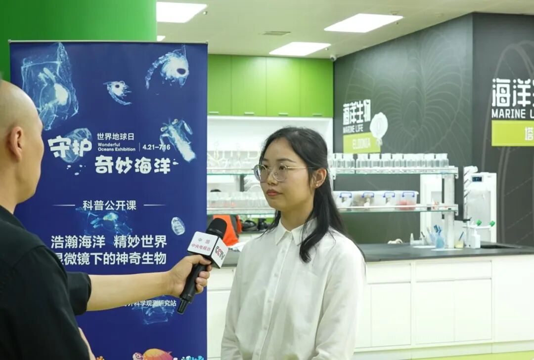 2 ?4 T0 C+ A y8 v# `( Z3 t 2023年世界地球日期间,南海生态中心作为主要支持单位之一,参与由华特迪士尼(中国)有限公司、大自然保护协会(TNC)在天津国家海洋博物馆共同主办的“守护奇妙海洋”公益影像展。以精美的图片及视频资料向社会公众生动展示了丰富多彩的海洋生物和海洋生态,并通过配套科普讲解、显微镜观察、手绘涂鸦等活动形式向中小学生传递认识海洋、保护海洋的理念。据不完全统计,当日观展人数近6000人,线下展览观展人数达80万人次,活动反响极佳。此次活动吸引了十余家媒体参与报道,央视新闻对此进行了长达一小时的视频直播,并对南海生态中心的专家进行了采访。 南海生态中心专家在“守护奇妙海洋”科普活动中接受央视采访