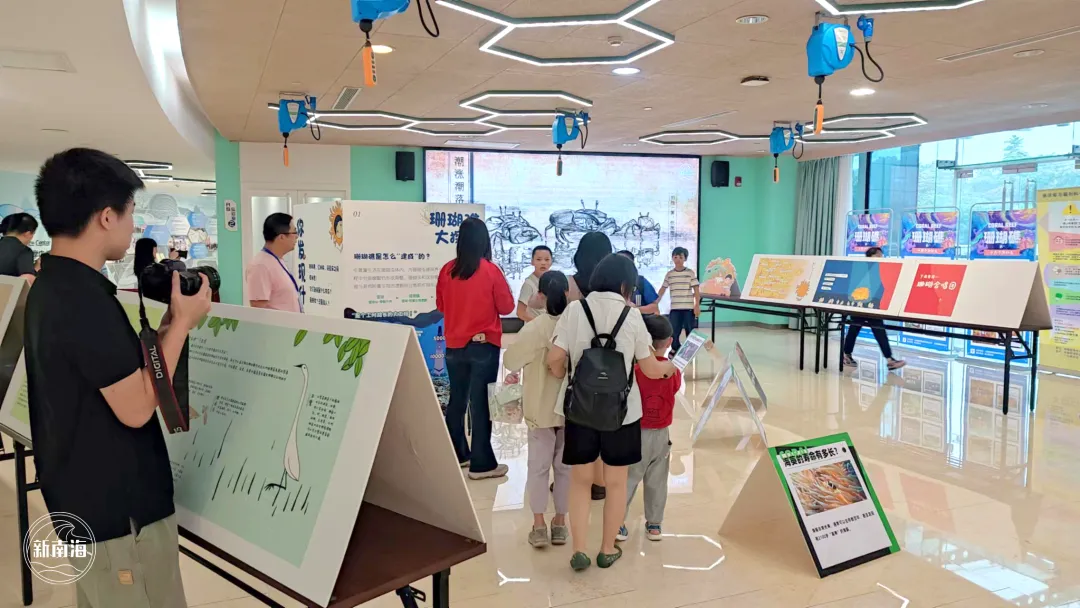 ( p$ {- r* y' _ \6 s) d 2024年世界地球日期间,“保护海洋生态 守护蓝色家园”海洋生态研学营地主题活动在广东科学中心举行。南海生态中心承办其中的海洋生态科普展及《欢迎来到小丑鱼的家园》《插上硬“核”科技的翅膀》2场讲座。展览首次采用揭秘的游戏形式围绕珊瑚礁、红树林、海草床三大典型海洋生态系统开展。展览以“你发现什么了?”的提问切入,让参观者通过不同形式的展览内容来认识珊瑚礁、红树林、海草床的特点,在展览中探寻三大典型海洋生态系统之间的关系。参观动线终点的“谜底”海报,揭秘各种疑惑,让参观者对三大典型海洋生态系统有了更深入的了解与思考。海洋生态科普展在地球日结束后延展至五一假期结束,五一期间观展人数达80000人次。