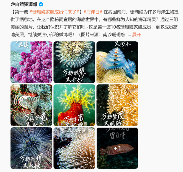 R9 Y; k6 L8 D$ I  在自然资源部微博发布的海洋生态宣传海报