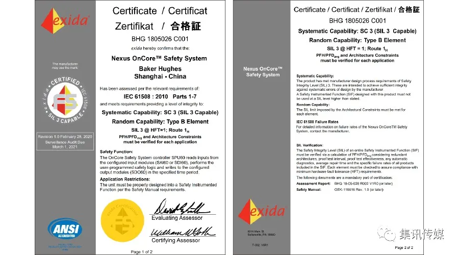 认证与突破 Baker Hughes NexusOnCore™获得SIL3安全认证& Z4 B2 b; i0 X; B; |