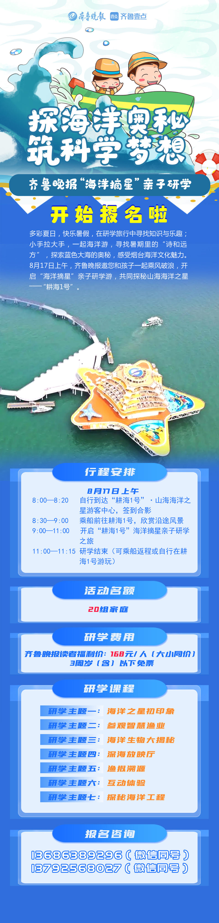 多彩夏日,快乐暑假,在研学旅行中寻找知识与乐趣;小手拉大手,一起海洋游,寻找暑期里的“诗和远方”,探索蓝色大海的奥秘,感受烟台海洋文化魅力。8月17日上午,齐鲁晚报邀您和孩子一起乘风破浪,开启“海洋摘星”亲子研学游,共同探秘山海海洋之星——“耕海1号”。
