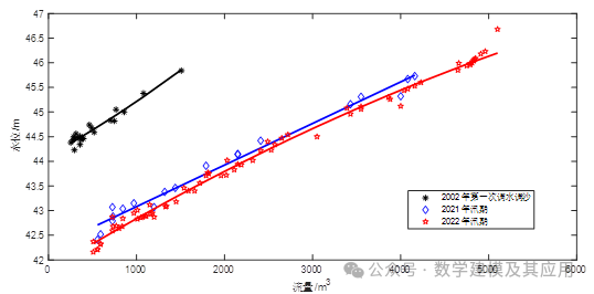 - `) b* W! p7 ?7 t x3 o# k 黄河孙口站历年调水调沙主槽过流能力趋势 由孙口站“调水调沙”后过流能力趋势图可以看出:水位~流量关系曲线逐渐右移,同水位流量增加,2022年较2002年同水位流量偏大2720m³/s,同水位45.00m对应的2002年相应流量556m³/s,2022年相应流量3280m³/s,过流能力增加明显。