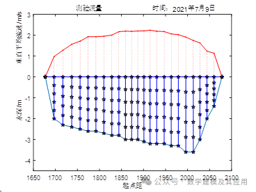 . r) |, {( d6 K! ^% u7 C; z ?6 `  对2021年7月9日的测验进行分析计算。首先是测点的布设,孙口水文站采用缆道流速仪常没法,利用23条固定垂线、每条垂线上在水面、相对水深0.2、0.6、0.8和河底处布设5点法测速,如下图所示。测验结果数据详见2023全国大学生数学建模E题附件3. i6 r) K* A0 p9 D+ m) A
