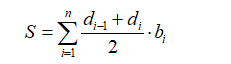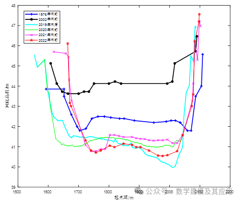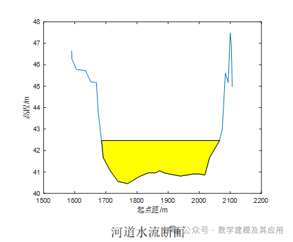 # k7 q3 }5 T {! e. ` 4.2.1水流断面面积计算 对河底高程进行三次样条插值,假设在调水调沙前,河床没发生大的变化,河底高程基本不变下,对河底高程进行三次样条插值。在对河底高程插值的基础上计算过水断面面积,可以采用离散梯形面积求和法:0 x; U' a. h3 A: G2 T