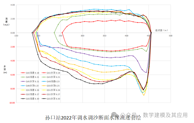 R, G, ^" Y+ Y$ i2 @% ~4 B 4.3“调水调沙”对河床演变的影响 以2022年为例,孙口站6月25日至7月1日,共施测流量6次。实测最大流量3970m3/s,相应水位45.60m,最大含沙量为6.17kg/m3,最大水深9.3m,最大流速3.46m/s,最大断面平均流速2.65m/s。对断面进行了实时套绘,本次洪水前至今,整体呈冲刷形态,冲刷位置由右岸逐渐向左移动,主流开始左移,如下图所示,图中6 ]2 b2 P( q; ]7 O( c3 _5 l