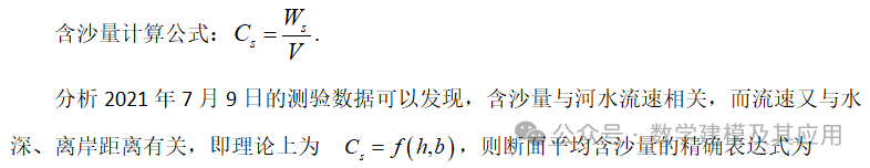 1 U- i6 ?" h, T2 R( a: T 4.1.2实测流量优化问题 问题:每次布线与测验都需较长时间,由于历时较长,水位会发生变化,测验过程也会受到其他不稳定因素影响,往往会产生系统误差,反而降低了测验精度。因此,需要优选误差小、精度高、施测时间短、减少工作量、最经济适用的流量施测方案。4.1.3实测含沙量计算模型! J; ^# j. _, }1 X& r' s