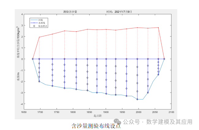 / }, S; w0 `8 D9 K# z  这里布设12条垂线,每条垂线上分别在水面、相对水深0.2、0.6、0.8和河底处布设5点取水,经24小时沉淀后测深水的质量,再用比对法测出水样的含沙量。利用上述计算含沙量计算公式,对2021年7月9日的测含沙量相关数据进行计算。