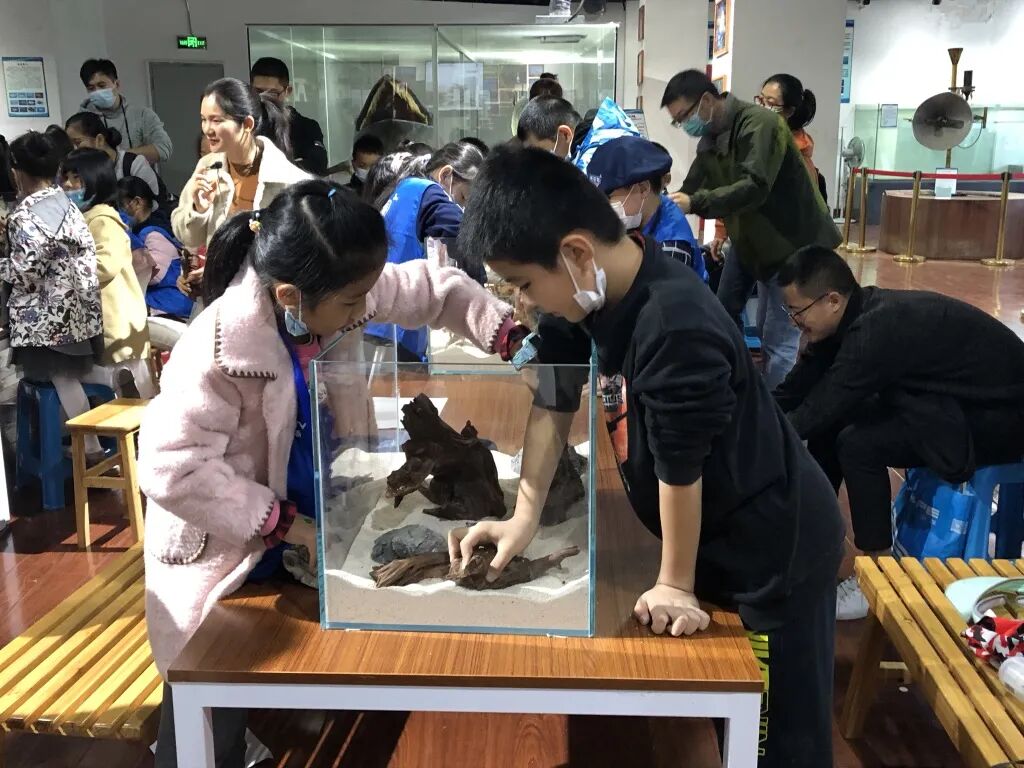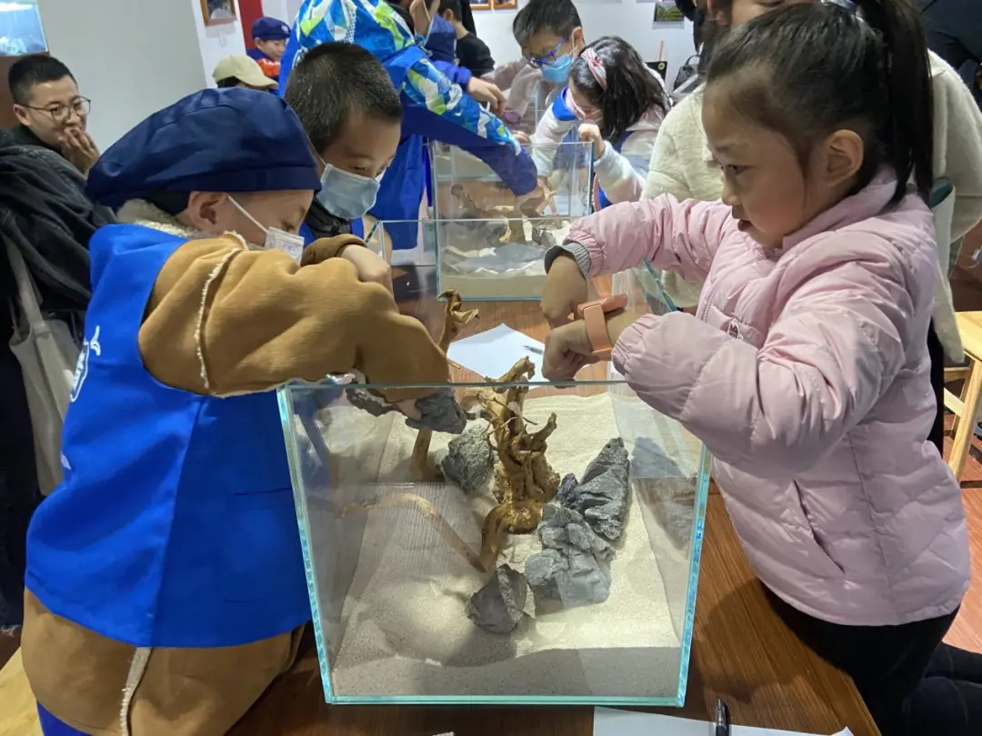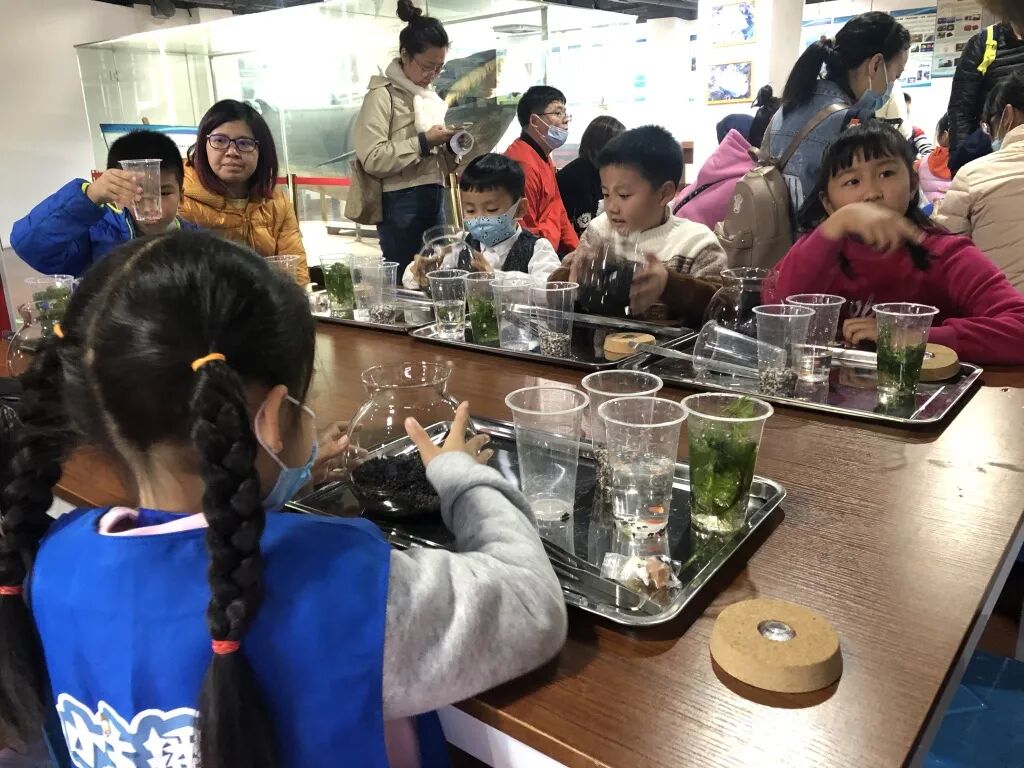 听讲结束后,小记者们分为AB两组,开始同时尝试不同的体验项目。A组的小记者先跟着博物馆讲解员参观各个展区,随后会体验多人合作鱼缸造景活动;B组的小记者先尝试了单人生态瓶活动,紧接着随着讲解员的脚步,踏进了各个展区丰富多样的海洋科技世界。 - X( @/ [# ~$ q3 T& _