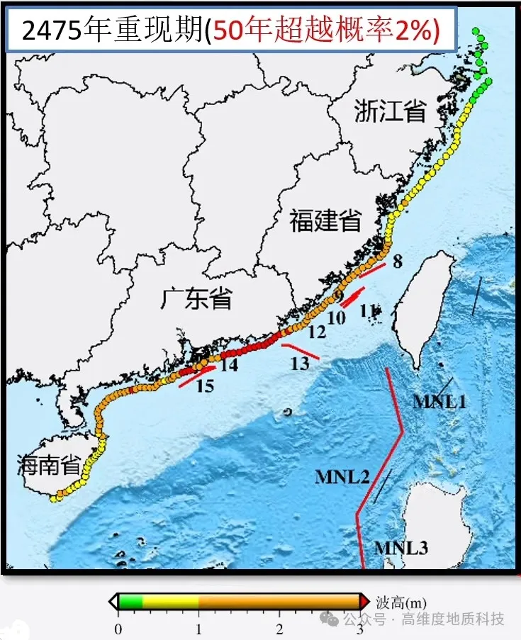 图6 沿海地震海啸危险性评估 分布:这些地质灾害在沿海地区以及深远海域都有发生。例如,风暴潮在沿海城市如厦门、深圳等地较为常见,赤潮则在黄海、东海等海域时有发生。影响:海洋地质灾害对沿海地区的经济、社会和环境产生严重影响。风暴潮和海啸可能引发海水倒灌、淹没陆地,造成重大经济损失和人员伤亡;赤潮则可能对渔业资源造成破坏,影响海洋生态平衡。