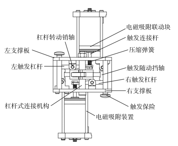 * \8 K9 J3 n$ T1 D! L 电磁吸附动力机构如图8所示,左右两侧电磁吸附、电源及无线控制模块主要包括一个电磁铁、吸铁、触发拉杆、一套独立供电电源、一套无线控制器,外部罩有聚四氟乙烯的透明保护罩。工作过程中红外无线控制器收到命令信号,给独立电源一个模拟量信号,控制电源开启与关闭,电源开启时,电磁铁上电,从而产生不低于50N的吸附力,电磁吸附联动块产生动作,触发连接杆与电磁吸附联动块连接在一起,同时也产生动作,从而完成触发随动挡销转动限位及触发杠杆限位。 9 a, N. k8 F) K5 L. E0 ]5 r