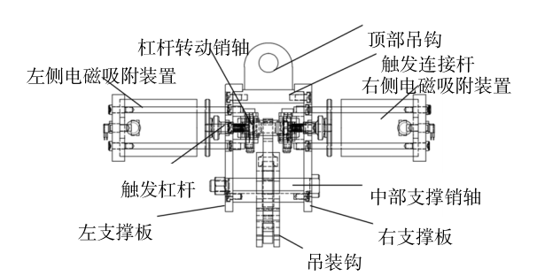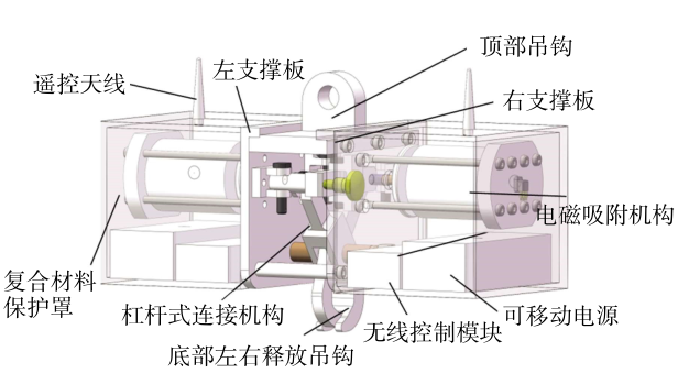 0 i# A9 a7 ~# z; K( { 针对复杂多变、高温、高盐、高湿等海上作业的特点及海上仪器设备布放需求,基于“蛟龙”号载人潜水器可弃抛载机构设计基础,提出了一种基于电磁驱动的红外遥控式海洋装备甲板吊装释放机构设计,该机构主要采用杠杆基本原理,通过机构限位的方式实现小力控制大力的效果,机构由电磁吸附机构、承载及机械释放机构和执行机构组成。左右两侧为独立的电磁吸附、电源及无线控制模块,左右两侧模块互为备用,可独立使用;中部为吊装承载及机械释放模块;每个模块由结构复杂的机构组合而成,各个子模块均可实现海上组装与更换,总体结构如图6所示。 p" [2 ^4 q, _# s! p g1 |