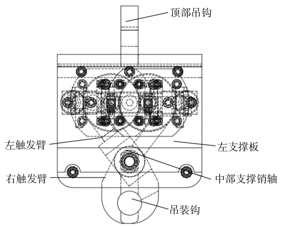 左触发杠杆、右触发杠杆、触发随动挡销、压缩弹簧等组成了执行机构,如图10所示。工作时压缩弹簧由于触发连接杆的动作处于被压缩状态,使得触发杠杆被触发随动挡销限位,当触发时,由于压缩弹簧的回复力使得触发随动挡销转动限位打开,随之触发杠杆限位打开,由于底部吊钩的重力使触发随动挡销转动产生转动,从而触发杠杆动作,完成了释放动作。