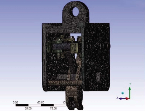 在计算中采用的材料属性:PA66的弹性模量为3.3GPa,泊松比为0.35,屈服极限为58.5MPa。根据采用多项式拟合法,测算出AL6061弹性模量为67.21GPa、泊松比为0.33。综合上述材料的力学性能,可满足结构设计要求,考虑耐腐蚀性的要求,拟采用PA66作为保护外罩的结构材料;考虑到经济性,拟采用AL6061作为执行部件(包括左触发杠杆、右触发杠杆、触发随动挡销、压缩弹簧)的结构材料;考虑到高冲击性及高负载能力,拟采用TC4作为受力构件(包括顶部吊钩、左支撑板、右支撑板及中部支撑销轴)的结构材料,现通过有限元方式对3种材料进行力学分析。 ! y F% R0 D) L7 p