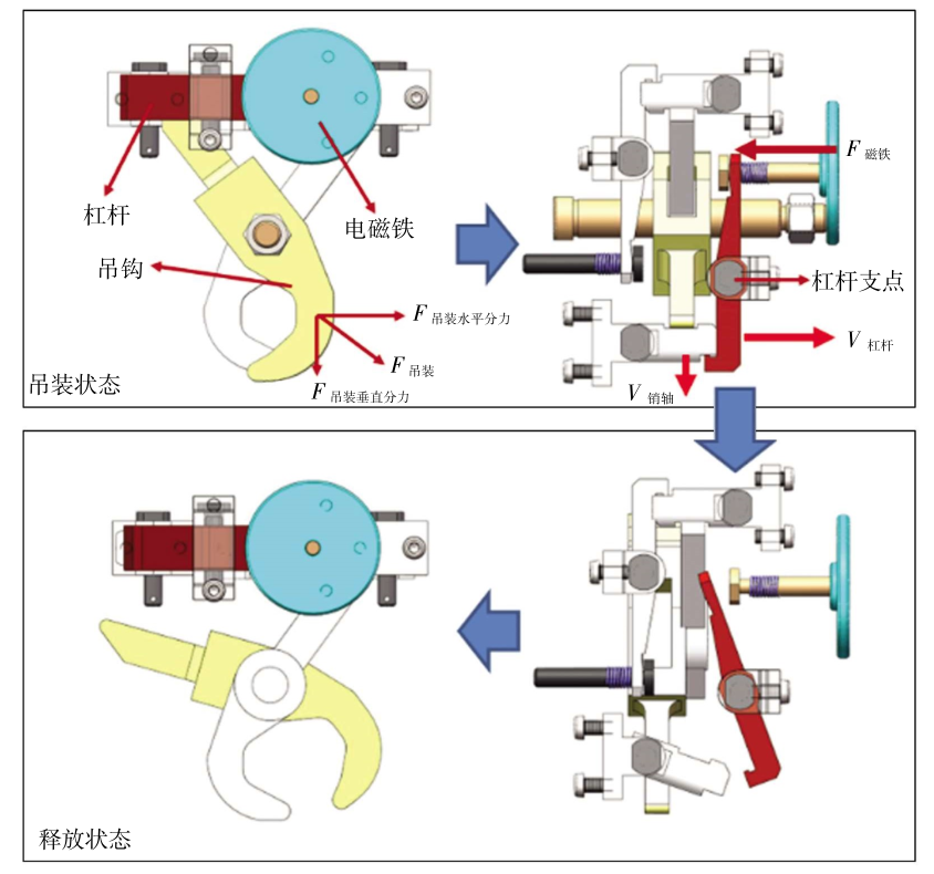 图7 电磁驱动的红外遥控式海洋装备甲板吊装释放机构工作原理 . ?8 U- r* ?- L8 y