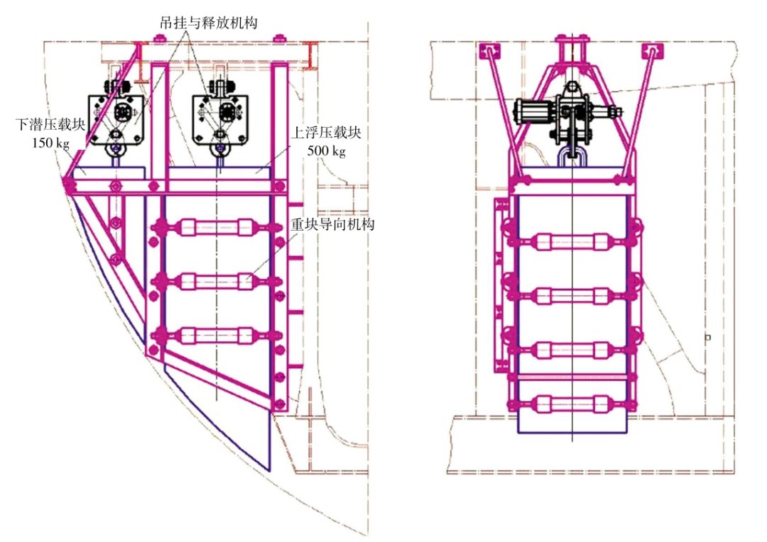 ; h# D$ W) `, J. n 我国“蛟龙”号载人潜水器可弃压载抛弃装置主要用于装载压载重块,并通过吊挂机构、重块导向机构挂于潜水器中,通过潜水器抛载电磁阀释放压载重块从而改变潜水器自身重力及浮力,以保证潜水器在下潜、上浮过程中的正常运行。 ' g F. n- Z) x* g) `8 f5 x