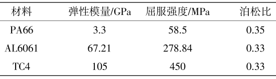 * i- U- C9 N `1 ]+ j 由于释放器主要在海上开展吊放工作,应充分兼顾到海上高盐、高温、高湿等极端情况,同时受海况影响还应考虑高冲击载荷等因素,拟采用尼龙(PA66)、铝合金(AL6061)、钛合金(TC4)作为备选材料,根据《机械设计手册》查询其力学参数如表1所示。 6 H* r1 e f1 E+ q