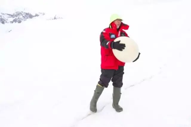 / Z' m1 S6 V4 D; V ▲ 首届国际南极双年展,中国艺术家张恩利和他的作品“蛋”(树脂玻璃钢,尺寸:40cm x 50cm, 重量: 5kg)