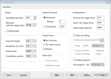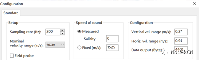 流速范围 流速测量范围的设置,流速范围大于实际最大流速,同时越接近越好。注:流速范围的确定可通过Configuration界面查看,如下图所示,当流速范围设定为0.3m/s时,垂向流速的测量范围为±0.27m/s,水平流速测量范围为±0.94m/s,该值为准确值。