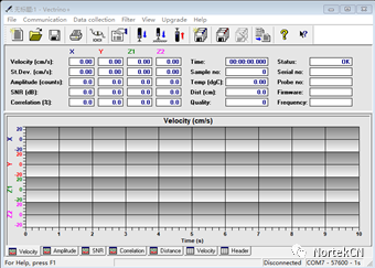 + ^9 Z; J" q7 B" m/ w5 s: | 简易使用说明 首先对小威龙的使用方法进行简易说明。对于大多数熟悉小威龙的老师、工程师和同学等可自行跳过该节。首次连接Nortek设备的电脑需安装RS232—USB驱动(Nortek专用U盘附带)和Vectrino plus软件。安装完成后,连接设备并供电后打开配置软件(Vectrino plus)。 ! h8 D' R! \( Y& [; ^0 J