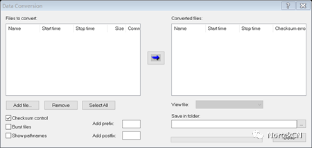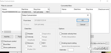 3 m% d. a& F4 B% i  点击“Add file”,选择相应的文件(数据文件后缀为.vno),再点对话框中中间的转换按钮,其它选项默认即可,点击ok后会生成相应的数据文件,其中.hdr格式文件为表头文件,可查看数据格式相应的解析。建议使用excil、matlab或者Notepad等程序查看数据文件。